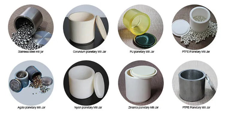 304 stainless steel mill jar, 316 stainless steel mill jar, tungsten carbide mill jar, agate mill jar, alumina ceramic mill jar(also called corundum mill jar), zirconia mill jar, nylon mill jar, polyurethane mill jar, Teflon mill jar (PTFE), and etc.