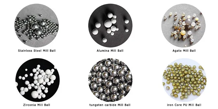 304 stainless steel mill balls, 316 stainless steel mill balls, tungsten carbide mill balls, agate mill balls, alumina balls, zirconia mill balls, and etc.