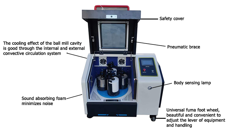 This small vertical square-size planetary ball mill machine with professional appearance modeling design, the shell is made of high-precision mold stamping forming, high-precision laser cutting, CNC bending forming, generous and delicate, high-end sedate, the planetary disc is made of casting forming, numerical control processing technology on structure component processing, transmission gear combination of high-temperature resistant non-metal and metal precision gear, nitriding metal heat treatment process, Can ensure abrasion resistance to prevent the broken shaft axis of rotation, to ensure smooth and quiet equipment running at a high speed, can watch the device monitor grinding jar can be self-locked locking synchronization at the same time, the operation is convenient, safe and reliable, shell in terms of product color, to bring new energy products, activate the product new life, in line with the international and domestic aesthetic demand, in line with the ergonomics.